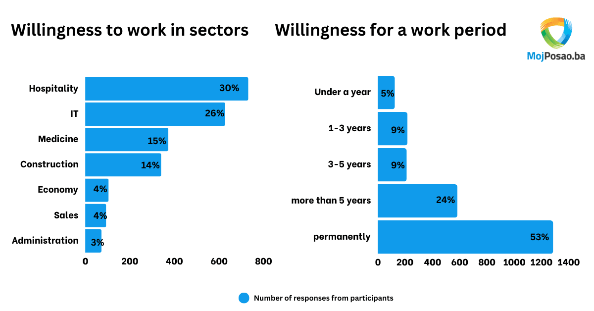 The research revealed that respondents are most interested in working in the sectors of hospitality, IT, construction, medicine, transportation, and logistics. In these sectors, there is a higher demand for certain professions, which are considered most sought-after or in deficit for specific industries this year. The main reasons for seeking employment outside Bosnia and Herzegovina but within the region include professional development, better working conditions, and social security. Bosnian-Herzegovinian workers are looking for competitive salaries, job security, and opportunities for professional advancement from potential employers in the neighboring countries.