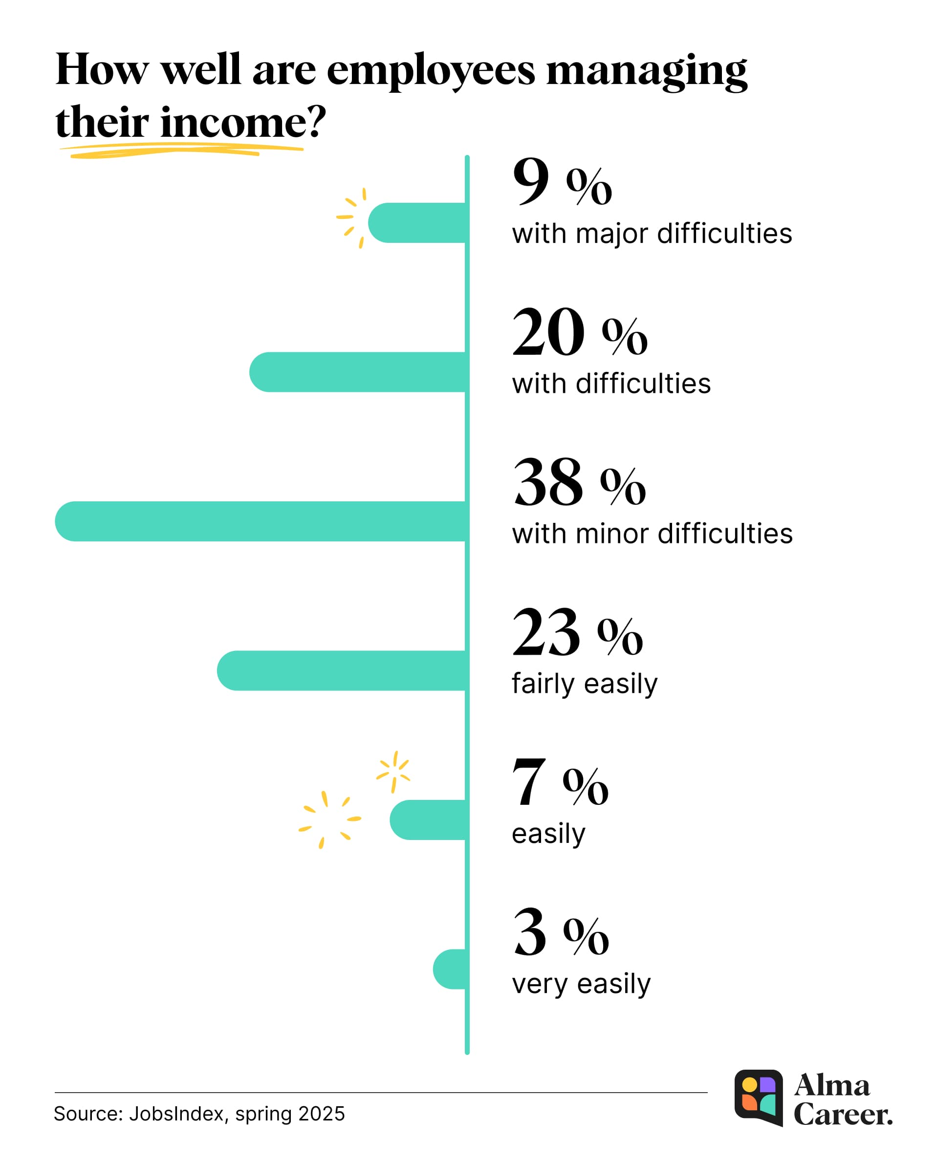 Only one-third (33%) of people say they can manage their income without problems. The remaining two-thirds admit to facing some level of financial difficulty. 29% report having a significant or serious problem living off their salary. Another 38% face minor difficulties.