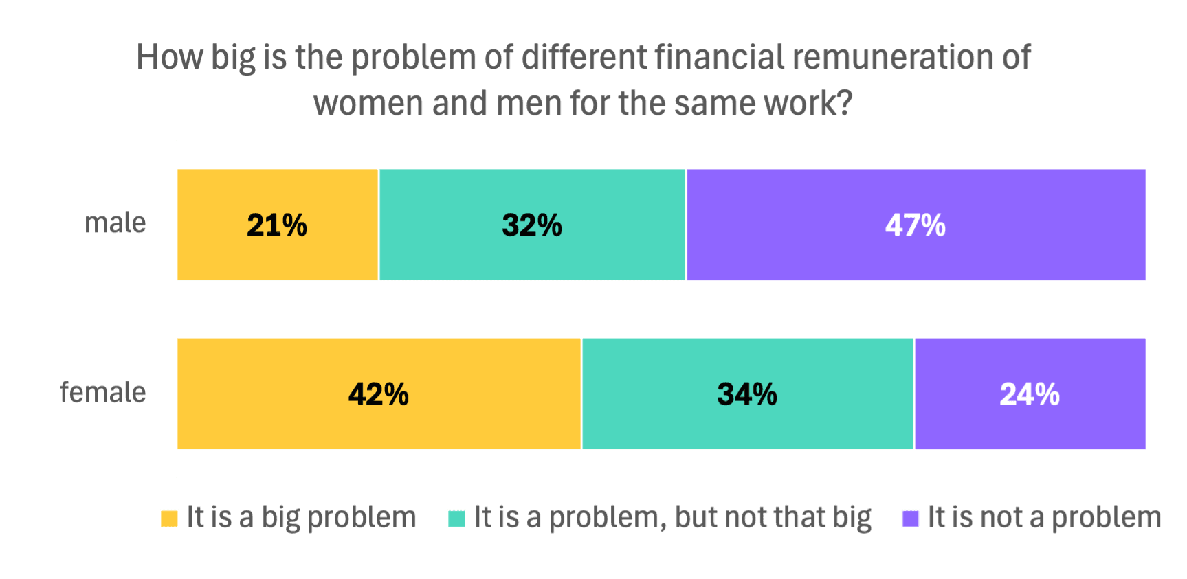 Women, on average, have lower salaries than men, and they naturally perceive the issue of unequal pay as a significant problem to a greater extent. However, the difference in salaries cannot be entirely attributed to the different behaviors of men and women when changing jobs, as the differences in the extent to which they ask for higher salaries during job interviews are minimal.