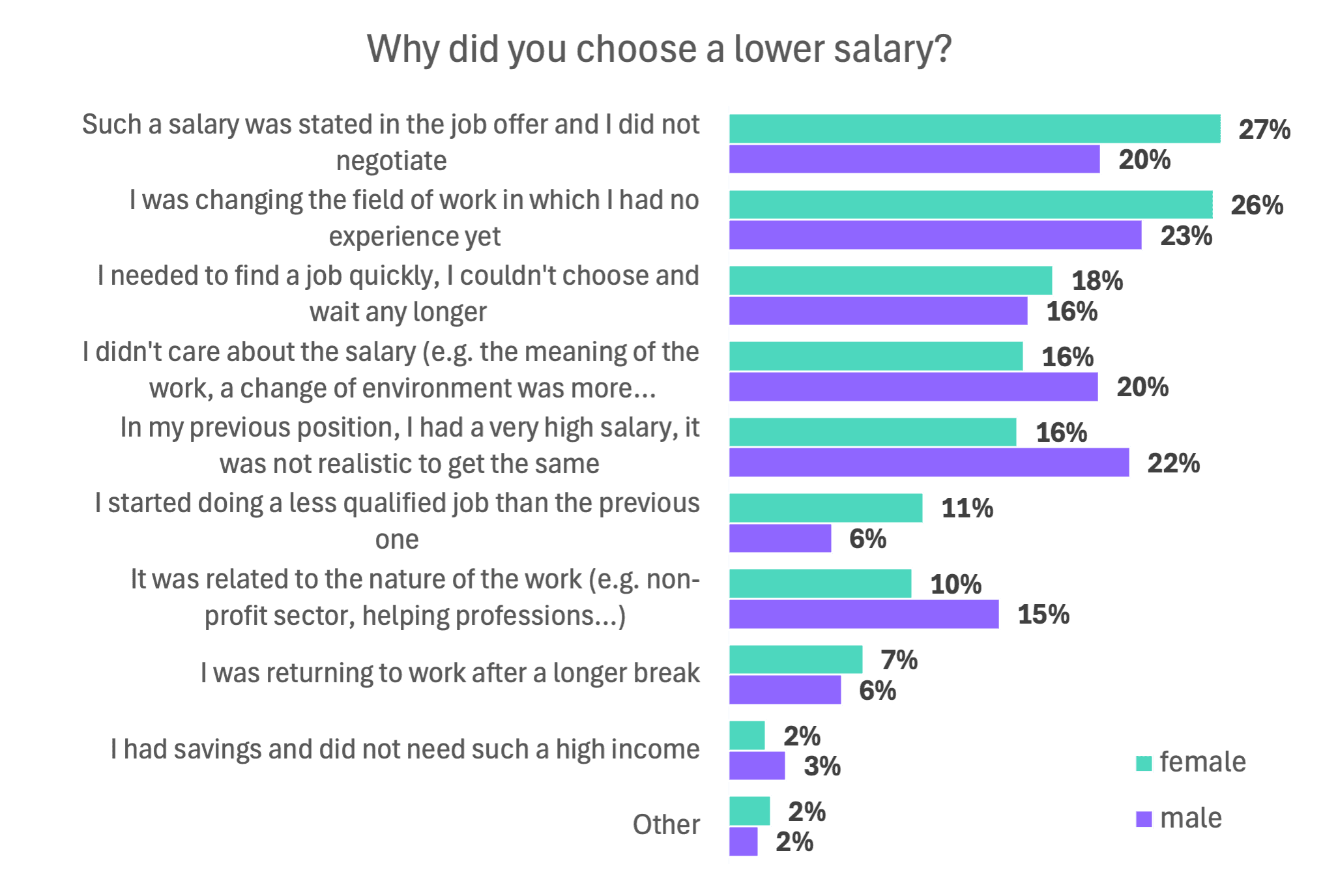 Men and women have somewhat different reasons for seeking or accepting a lower salary. For women, the primary reasons are that the salary was specified in the job advertisement (27%) and a change in the field of work (26%). For men, the top two reasons are a change in the field of work (23%) and having had a high salary in their previous job (22%). This is also the biggest difference between men and women; men are more likely than women to accept a lower salary because they had a high salary in their previous job, which is unrealistic to expect again.