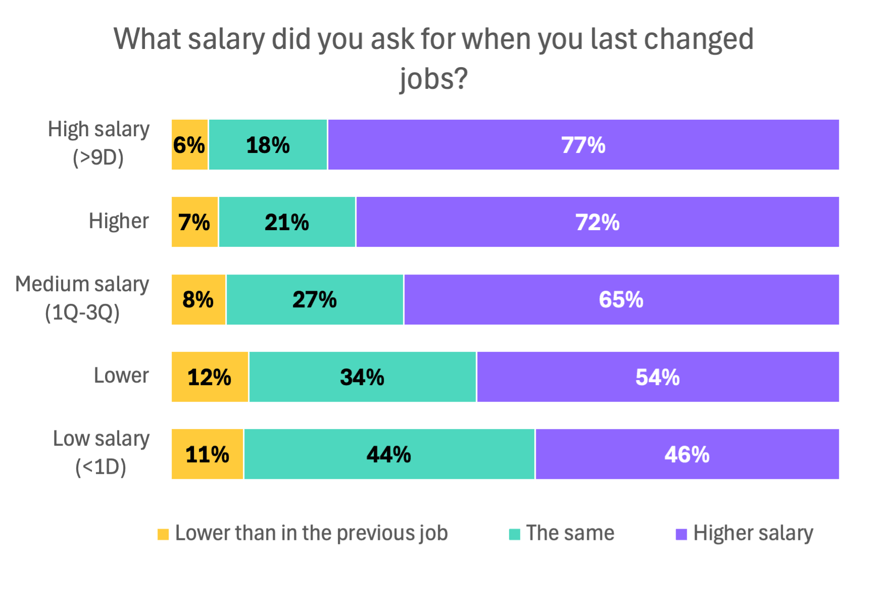 Respondents with low salaries generally seek smaller increases when transitioning to a new job. Among those who asked for a higher salary and belong to the lowest salary bracket (bottom 10%), the majority (60%) asked for just a 10% increase compared to their previous job. One-fifth (18%) asked for a salary more than 20% higher than their previous job.