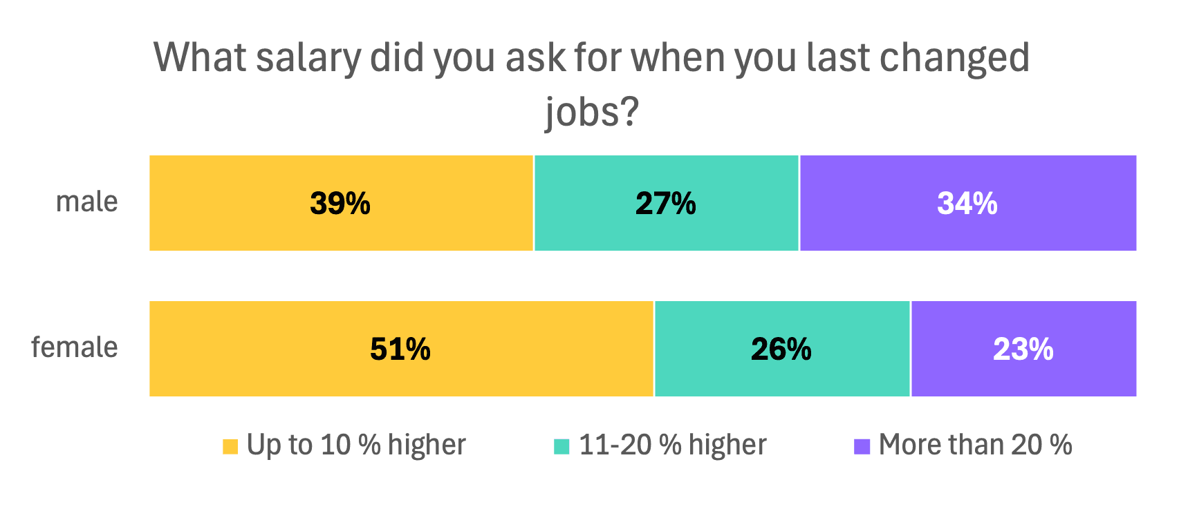 In addition to being more likely to seek a higher salary, men, on average, also ask for a larger increase. Among respondents who sought a higher salary, one in three men (34%) on average asked for a 20% higher salary than they had in their previous job, while one in four women (23%) did the same. A slight increase, up to 10%, was sought by 39% of men and half of the women (51%).
